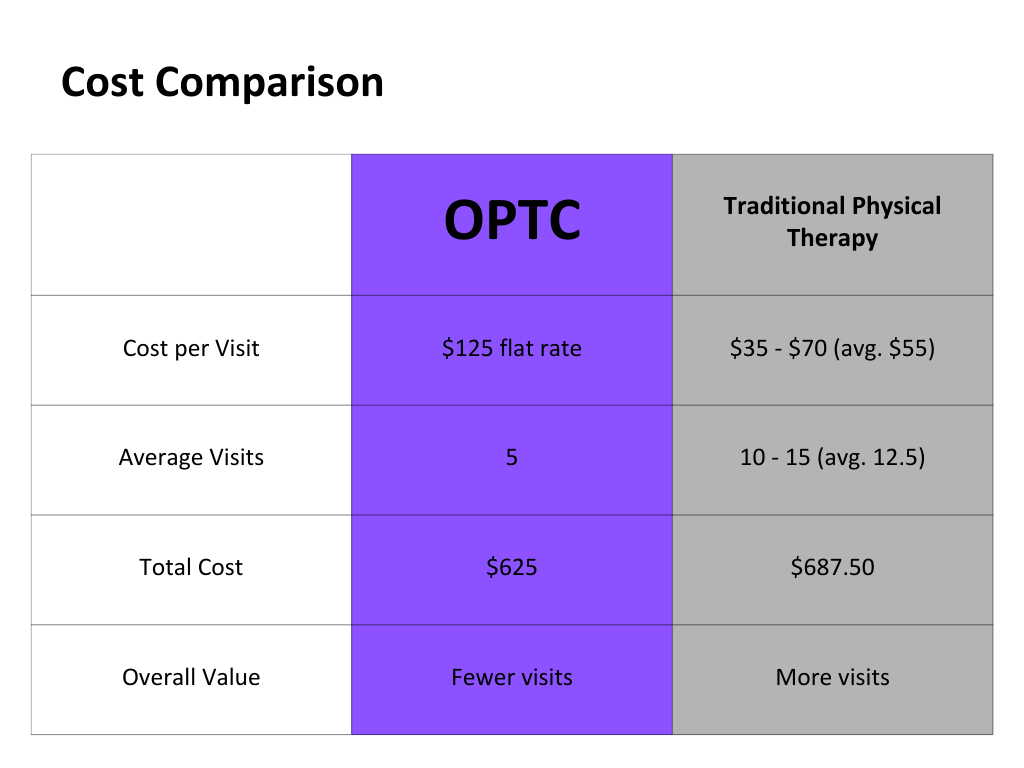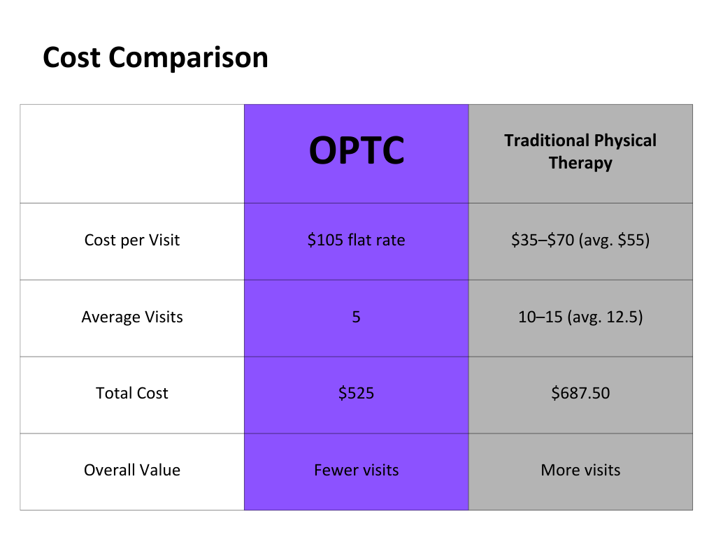 At Osteopractic Physical Therapy of the Carolinas (OPTC), we do things differently—and intentionally. Our model is designed to deliver better outcomes in fewer visits, saving you both time and money, while providing an unmatched level of individualized care.