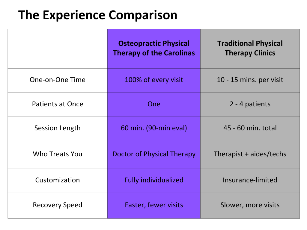 At Osteopractic Physical Therapy of the Carolinas, we believe better care shouldn’t take longer or cost more—and our model proves it.