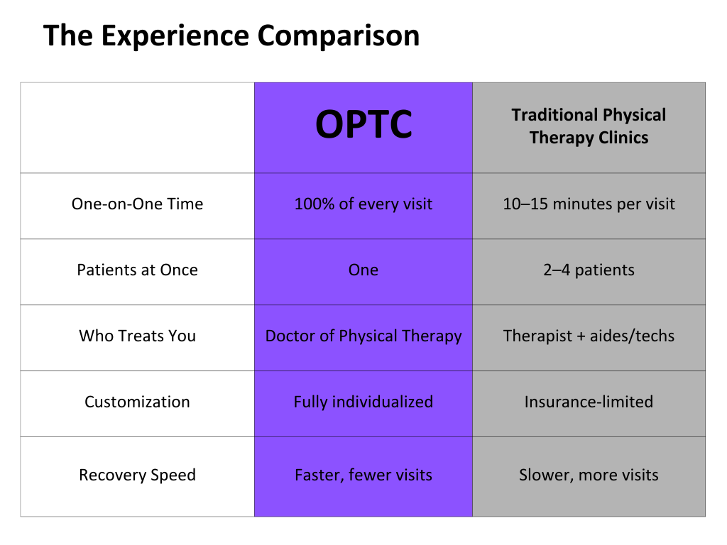 In traditional insurance-based physical therapy clinics, therapists are often required to treat 2–4 patients per hour, resulting in only 10–15 minutes of one-on-one time per visit. The remainder of your session is typically supervised by assistants or technicians.